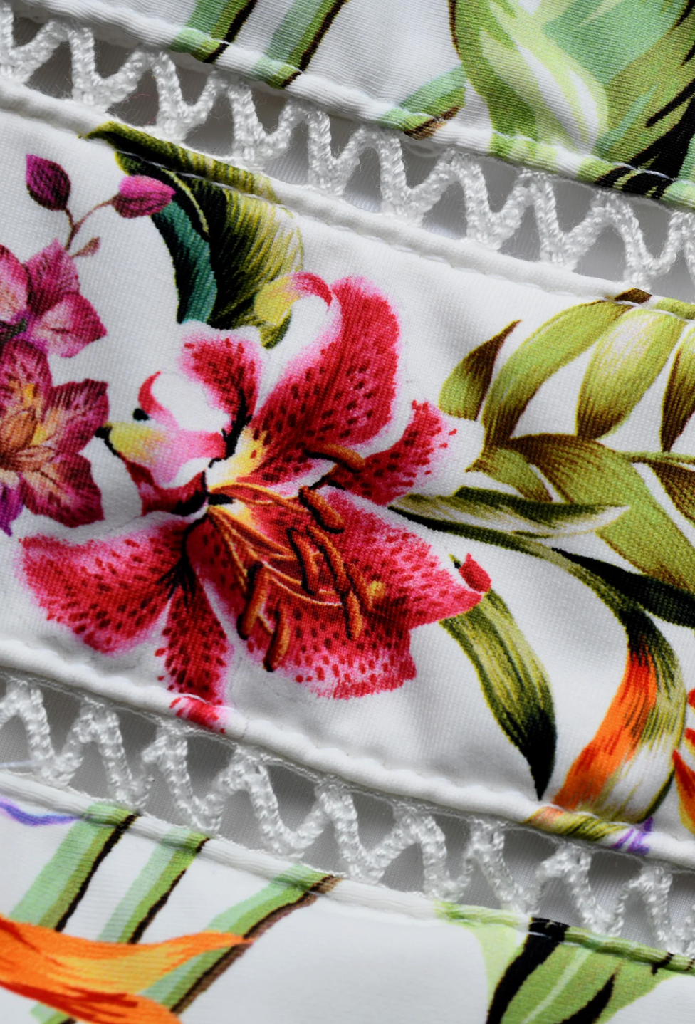 This lively floral design exudes a fresh, summery feel, perfect for a stylish and exotic beach look. This swimsuit cover-up dress offers a relaxed and breezy fit, perfect for effortless comfort on warm days. The lightweight fabric and flowy silhouette allow for easy movement, while the adjustable straps and lace detailing add a flattering, stylish touch.