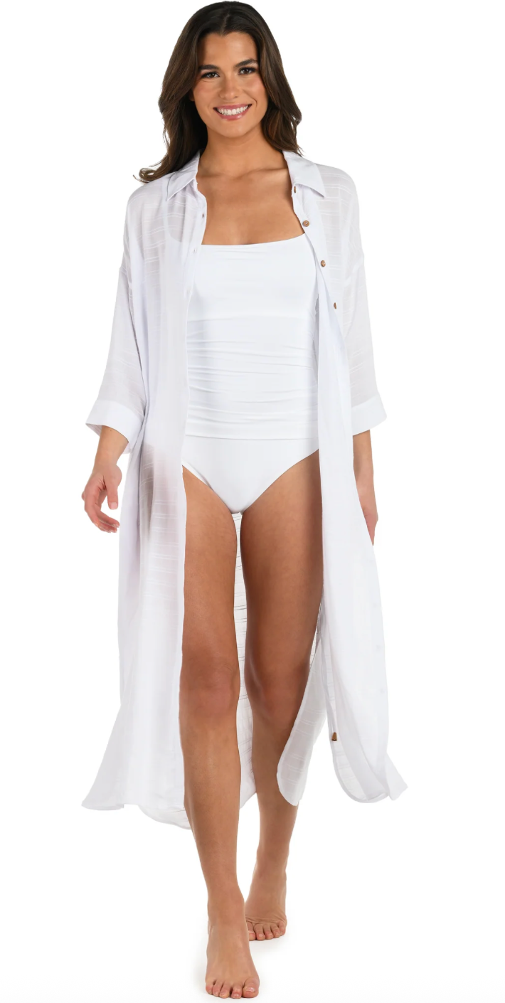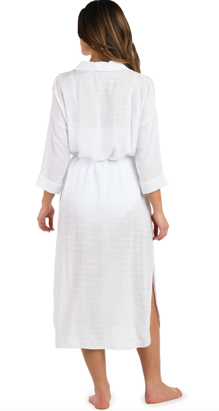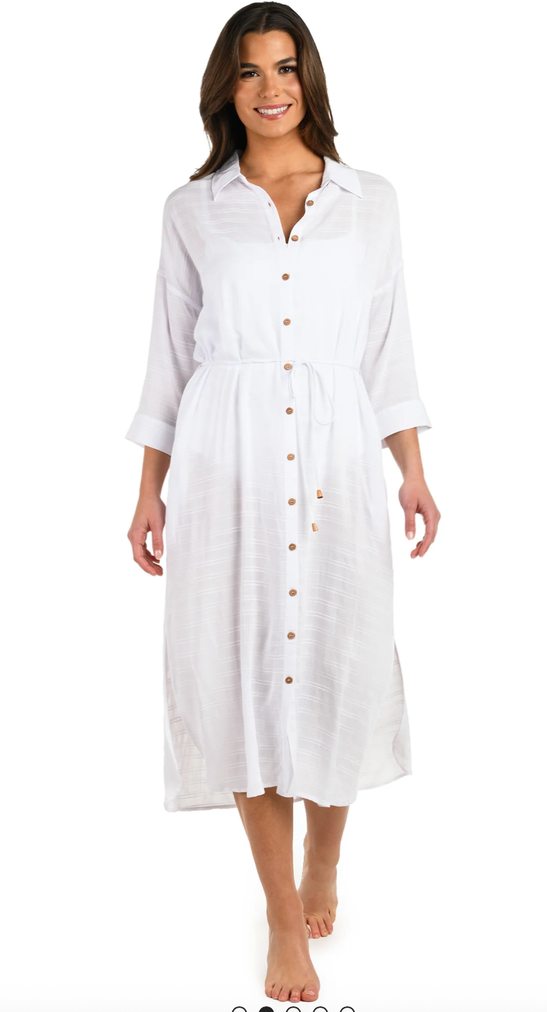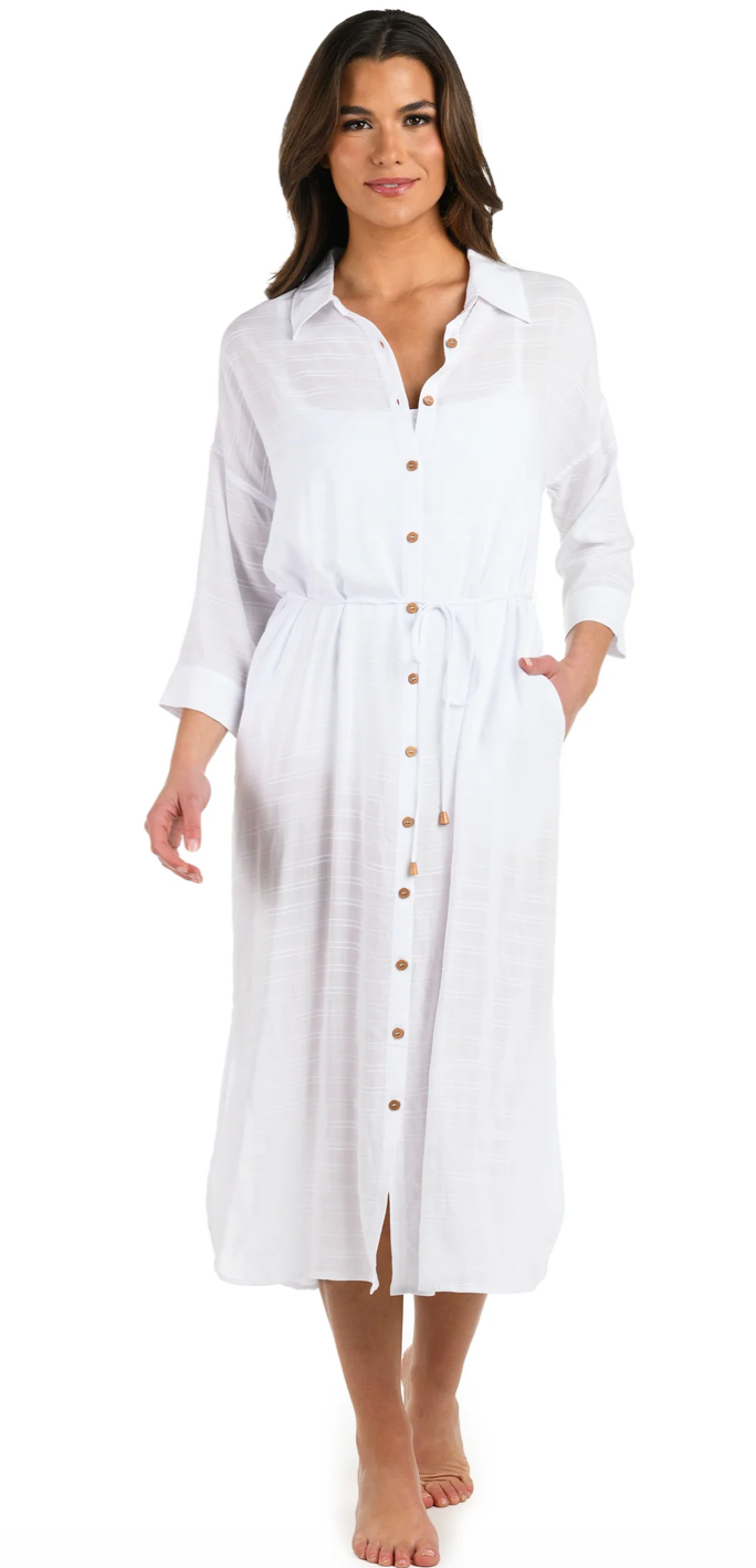 A vibrant white dress that brings effortless charm! Made from lightweight, textured fabric, it boasts a button-down front and an adjustable drawstring waist for a flattering silhouette. Its relaxed fit and three-quarter sleeves make it a versatile, breezy choice for casual outings or beachside adventures.
