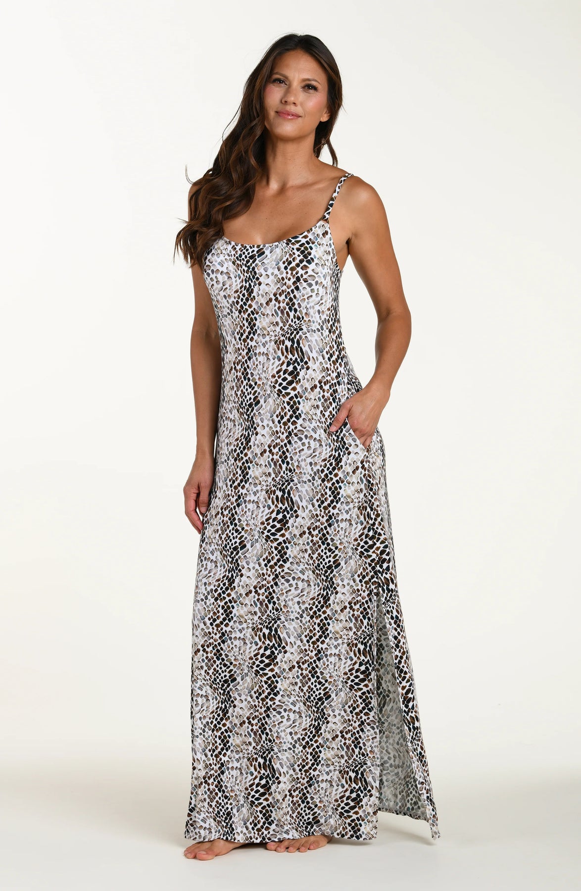 This Maxi Tank Dress from our Wild Whispers Collection features a figure-flattering style, with a built-in shelf bra, over the shoulder straps adorned with rings, and side slits for versatility.