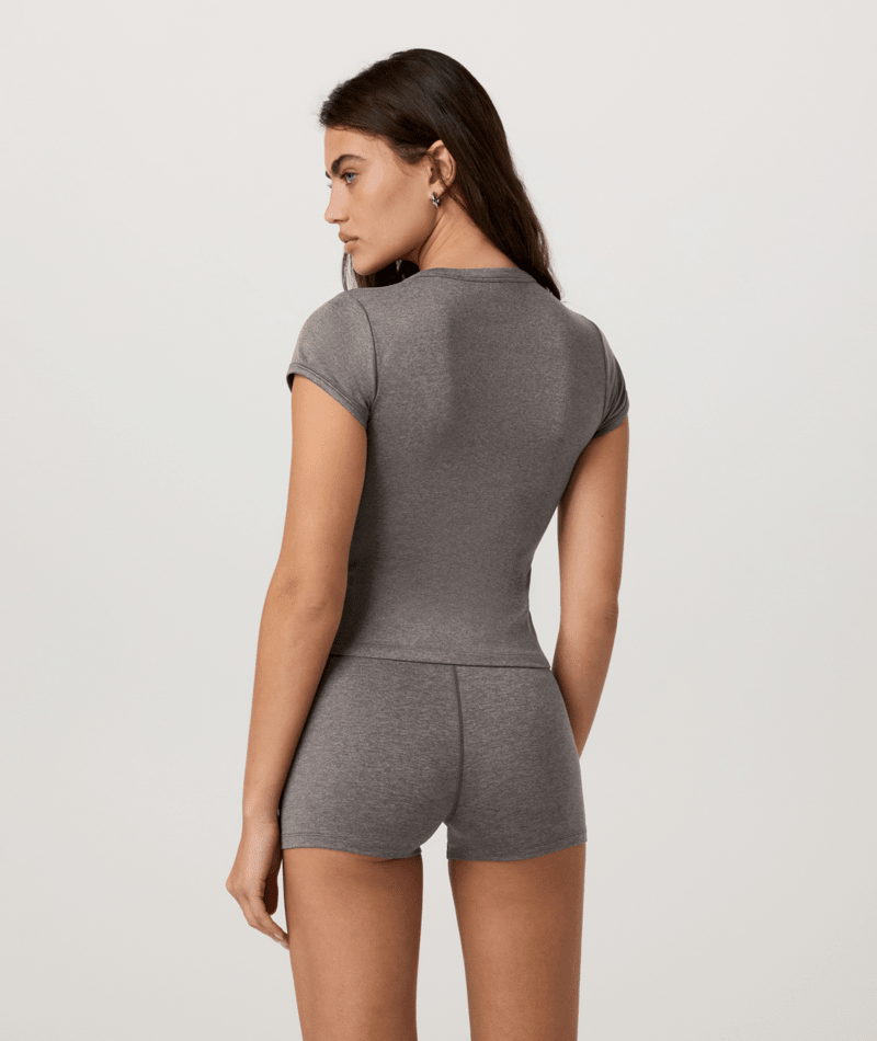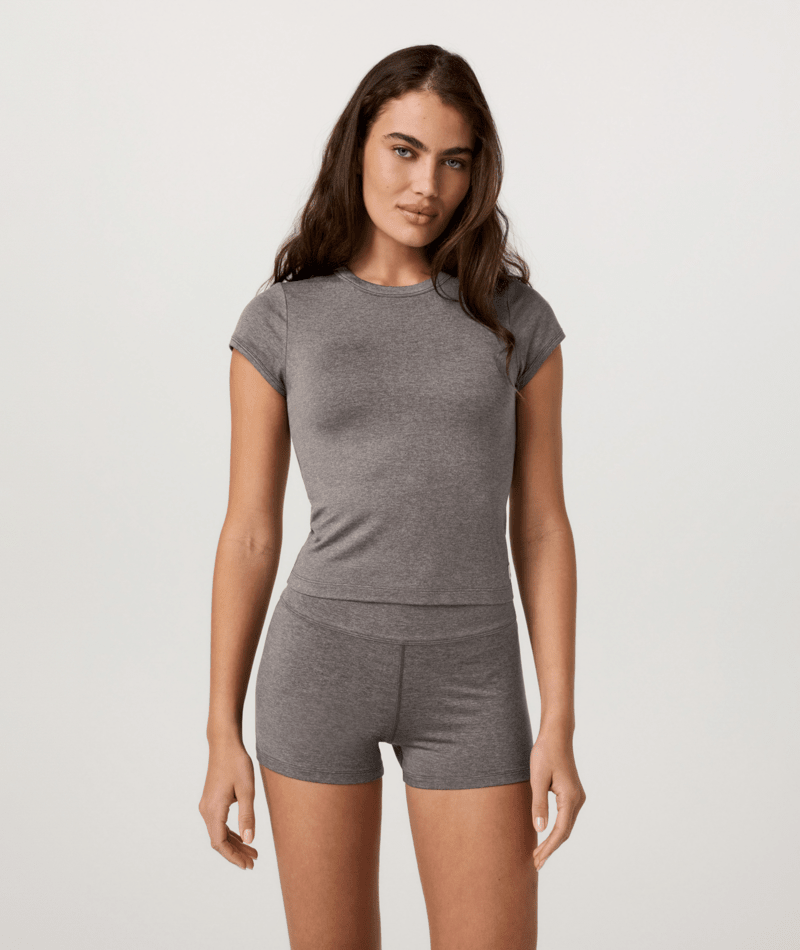 Get into baby tee bliss with this flattering women's shirt. Built with our super soft brushed DreamKnit™ fabric made from 89% recycled materials, the Halo Baby Tee features a classic crewneck, subtly capped sleeves, and a slightly cropped fit. Pair this women's baby tee shirt with any of our DreamKnit™ bottoms for the perfect active outfit.