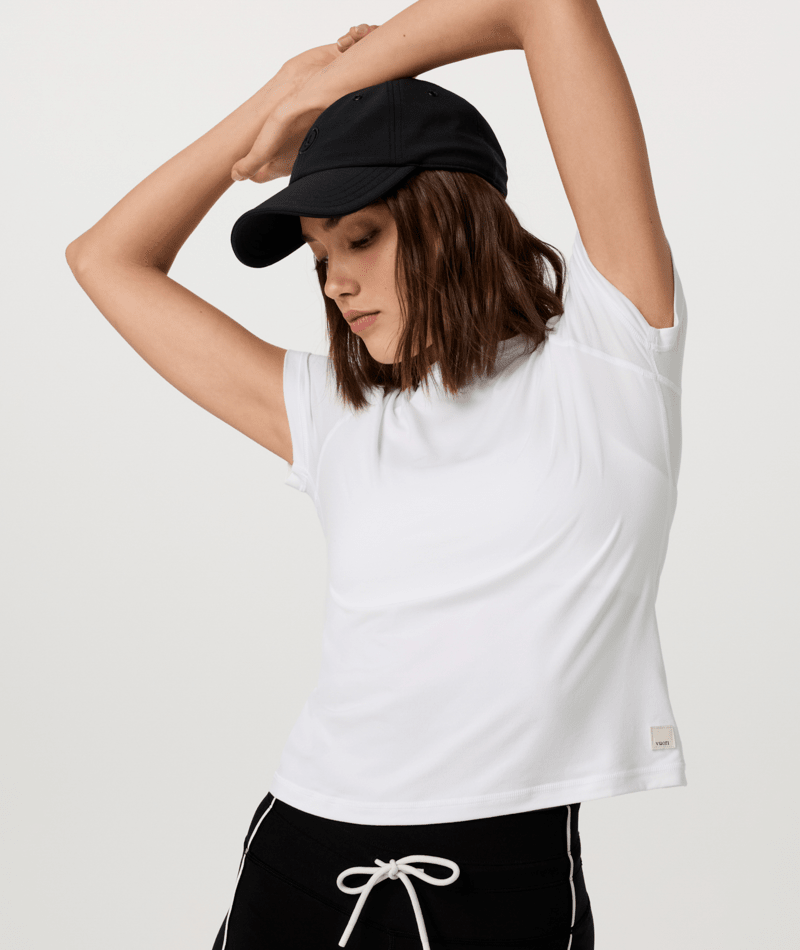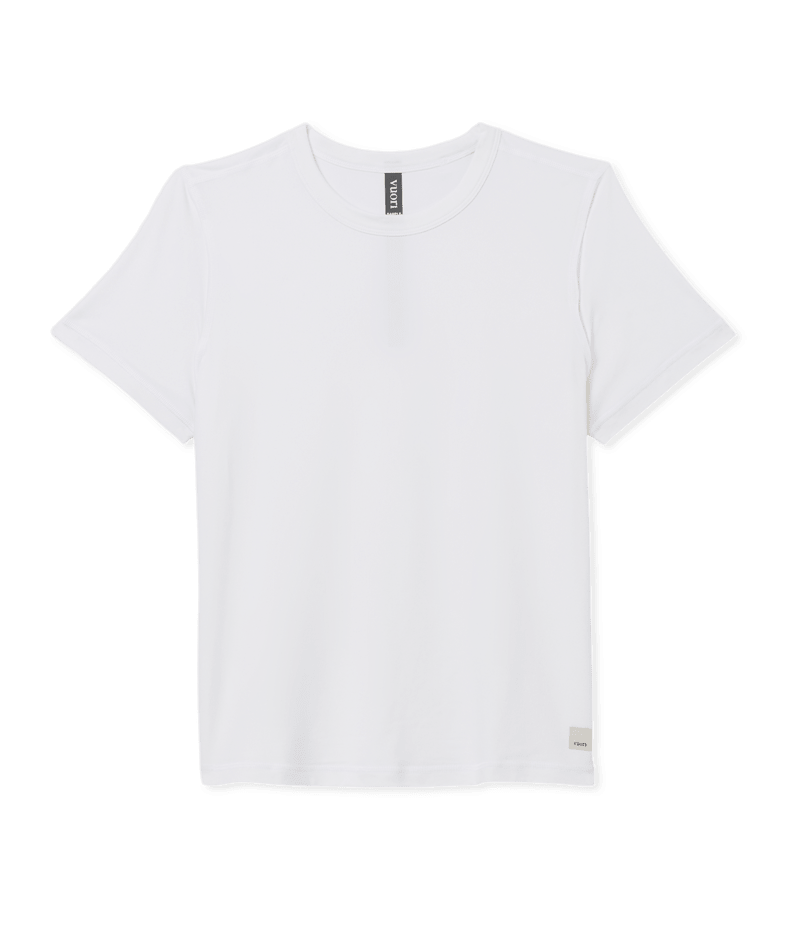 Moisture wicking performance jersey, recycled polyester, crewneck, short sleeve, woven logo patch, fitted, high hip length