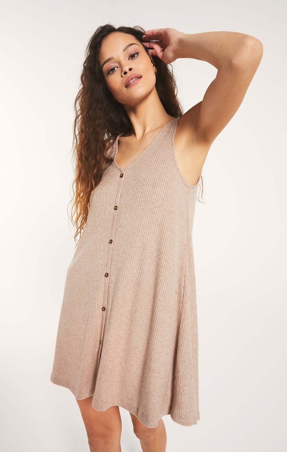 Swing into fall! This loose-fitting v-neck women's tank dress has a breezy swing to the skirt that makes this style a seasonal must-have, and the rayon blend rib knit fabric adds a comfy softness. Faux horn buttons go from top to bottom on the front, making for an adjustable neckline. Pair with a statement jacket and boots for a fall look that stands out.