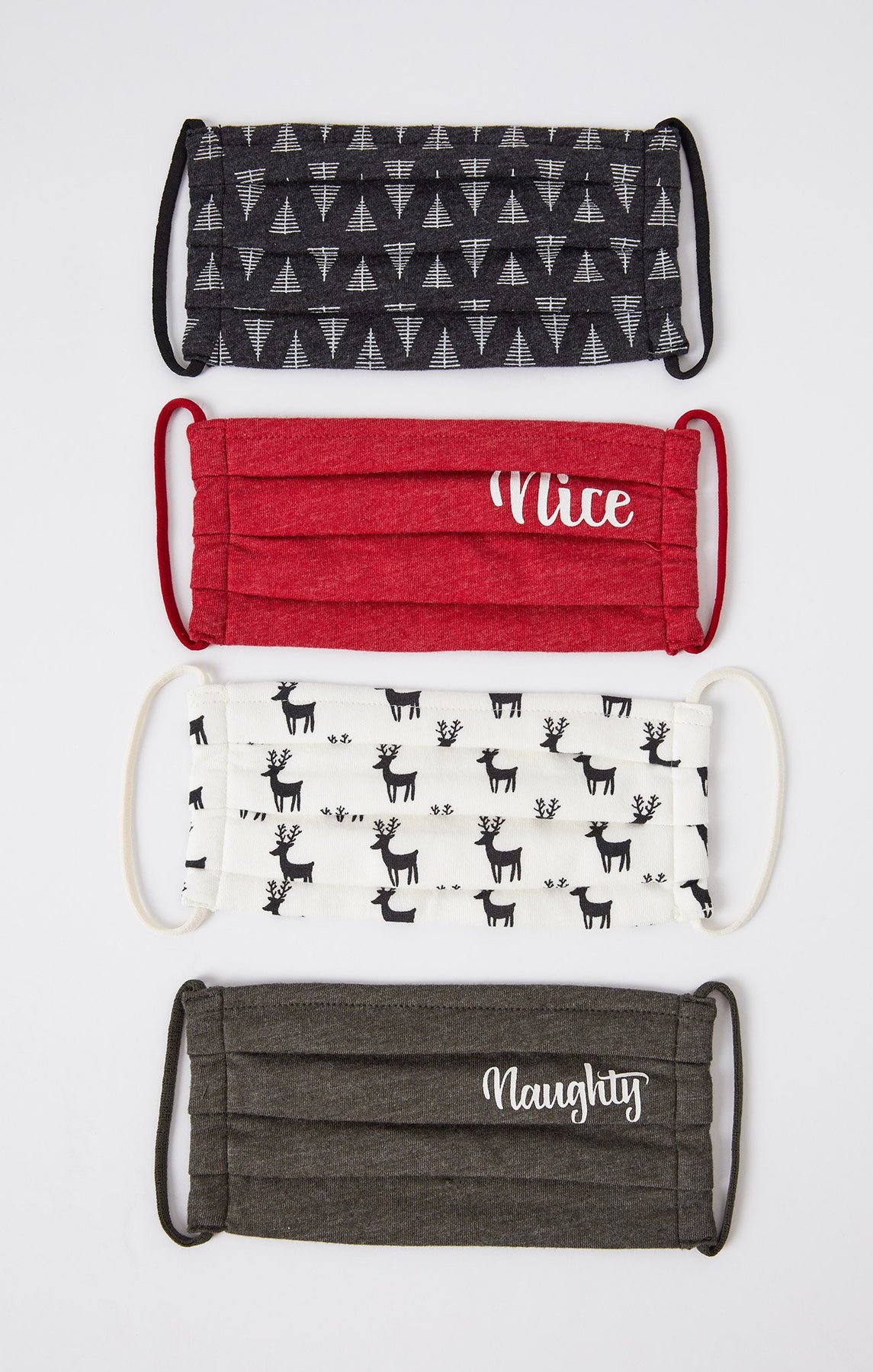 The Nice Reusable Face Mask (4-Pack) contains four unisex non-medical pleated masks; one Vanilla Ice with a reindeer print, one solid Rosin with the word 'naughty', one solid Red with the word 'nice', and one Charcoal with trees. They are made from a cotton jersey knit fabric with a 100% cotton lining and antimicrobial spandex jersey interior. Each mask has elastic straps that go over each ear for easy wear.