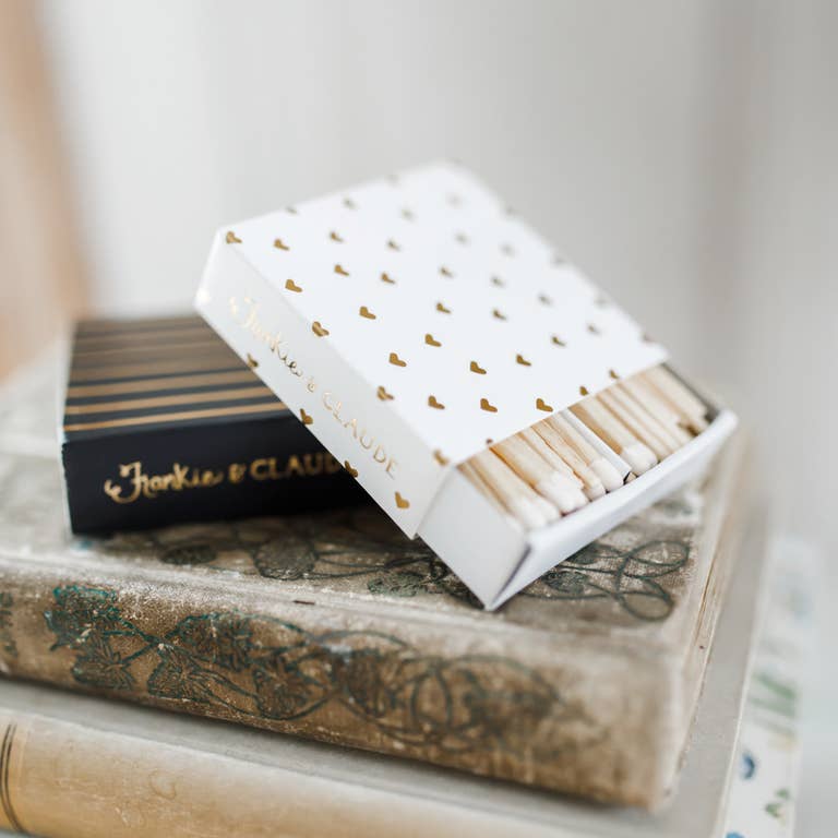 Our oh-so-pretty Fancy Matches™ now in a pretty gold foil patterned box. A match-striker is included on the side of the box.