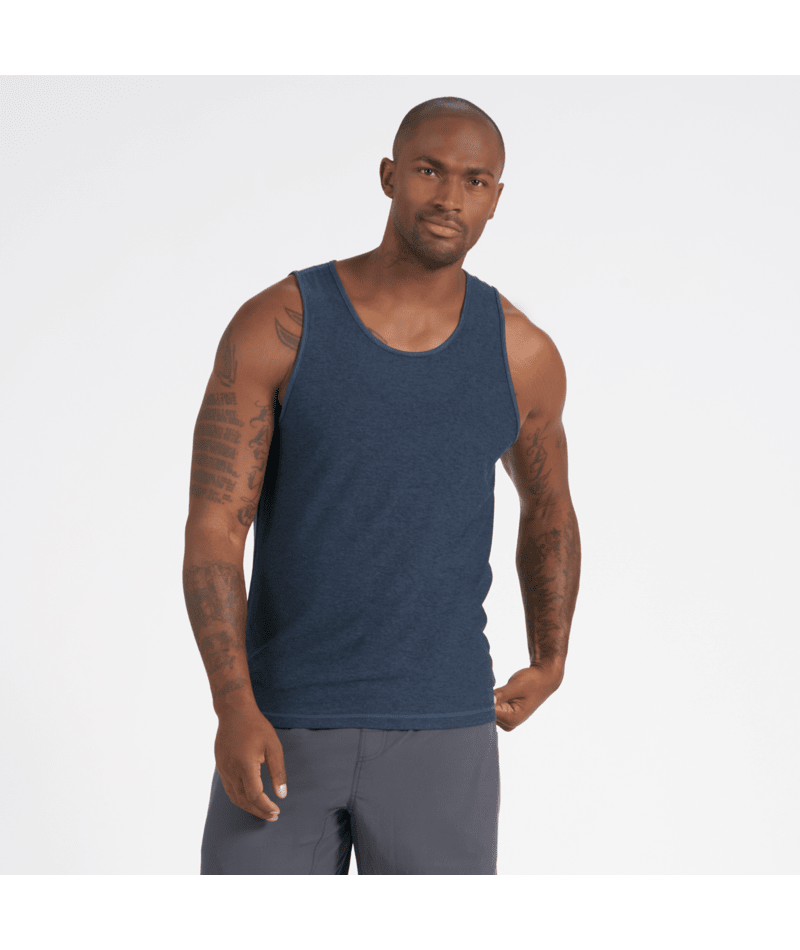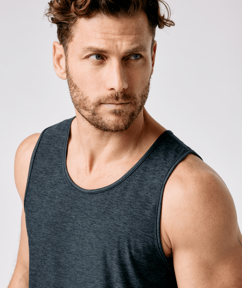 Performance 4-way stretch moss jersey sleeveless tank, moisture wicking, next level comfort, woven logo label