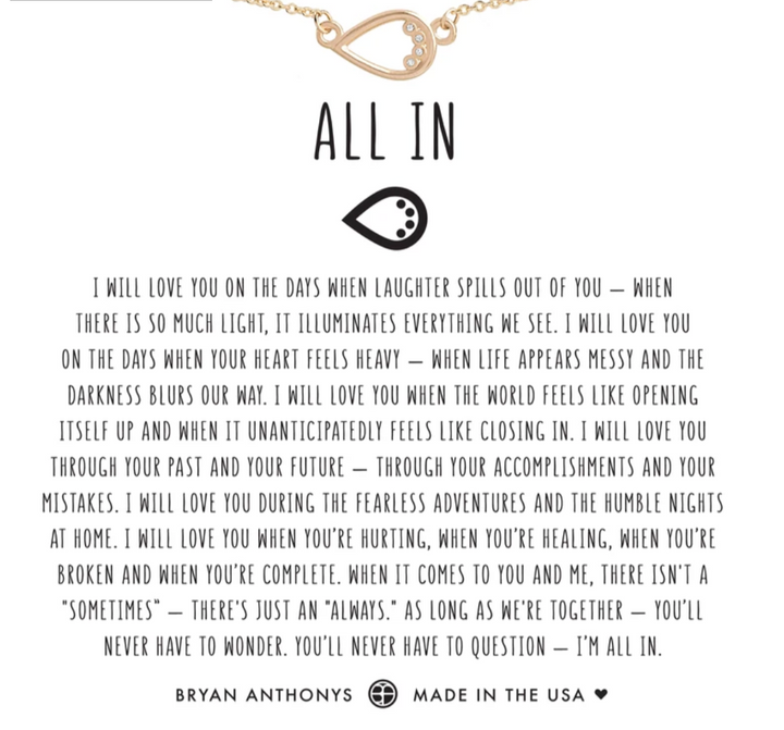 I will love you on the days when laughter spills out of you — when there is so much light, it illuminates everything we see. I will love you ON The days when your heart feels heavy — when life appears messy and the darkness blurs our way. I will love you when the world feels like opening itself up and when it unanticipatedly feels like closing in. I will love you through your past and your future — through your accomplishments and your mistakes. I will love you during the fearless adventures and the humble nights at home. I will love you when you’re hurting, when you’re healing, when you’re broken and when you’re complete. When it comes to you and me, there isn't a "sometimes” — there's just an "always." As long as we're together — you’ll never have to wonder. You’ll never have to question — I’m all in.